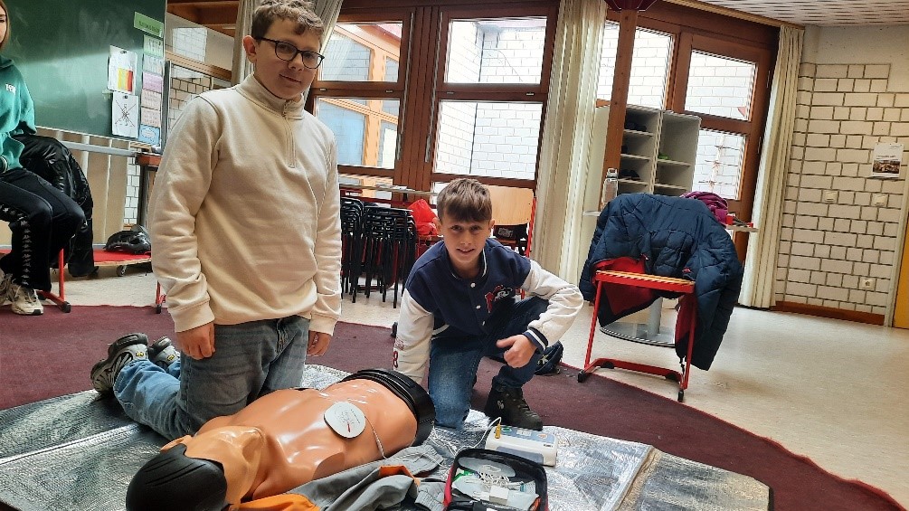 Unter der fachkundigen Leitung der Schulkrankenschwester und erfahrenen Erste-Hilfe-Lehrkraft des Deutschen Roten Kreuzes (DRK) erlernten die Jugendlichen wichtige Grundlagen der Ersten Hilfe. Von der stabilen Seitenlage über das Anlegen von Verbänden bis hin zur richtigen Reaktion in Notfallsituationen – die Schülerinnen und Schüler wurden auf vielfältige Szenarien vorbereitet.
