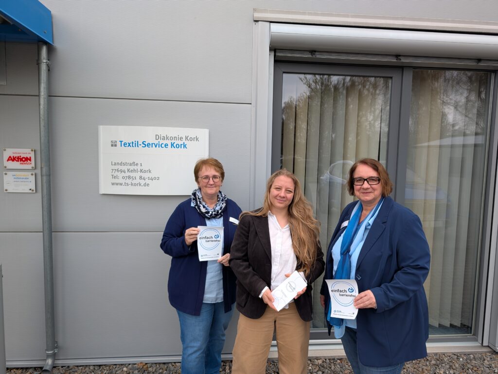 Kürzlich erhielt das Inklusionsunternehmen Textil-Service Kork von der Lebenshilfe Offenburg-Oberkirch-Lahr e.V. die Auszeichnung „einfach, barrierefrei…“. Die Auszeichnung würdigt Unternehmen, Organisationen und Vereine, die sich für Barrierefreiheit einsetzen und somit Angebote für alle Menschen schaffen. Die Textil-Service Kork gGmbH erbringt seit 2014 Dienstleistungen im Bereich der Textilbearbeitung. 40% der Mitarbeitenden haben eine Beeinträchtigung und arbeiten in der Inklusionswäscherei auf dem ersten Arbeitsmarkt. Barrierefreiheit bedeutet für das Unternehmen unter anderem Arbeitsprozesse so zu gestalten, dass Teilhabe für alle Mitarbeitenden möglich ist. Ein besonderes Projekt ist die Entwicklung und Einführung einer barrierearmen App, die Arbeitsabläufe Schritt für Schritt über Tablets erklärt. So können die Mitarbeitenden eigenständig lernen, Inhalte jederzeit wiederholen und sicherer arbeiten.