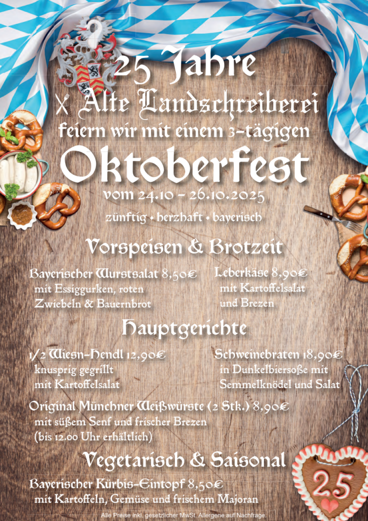 Die Gäste dürfen sich auf bayerische Spezialitäten wie Original Münchner Weißwürste, Leberkäse, Wurstsalat, Brezen, Wiesn-Hendl, Schweinebraten sowie einen vegetarischen bayerischen Kürbis-Eintopf freuen, serviert mit leckeren Beilagen. In stimmungsvoller Atmosphäre bietet das Fest Gelegenheit, gemeinsam auf 25 Jahre Alte Landschreiberei zurückzublicken und dieses besondere Jubiläum zu feiern.